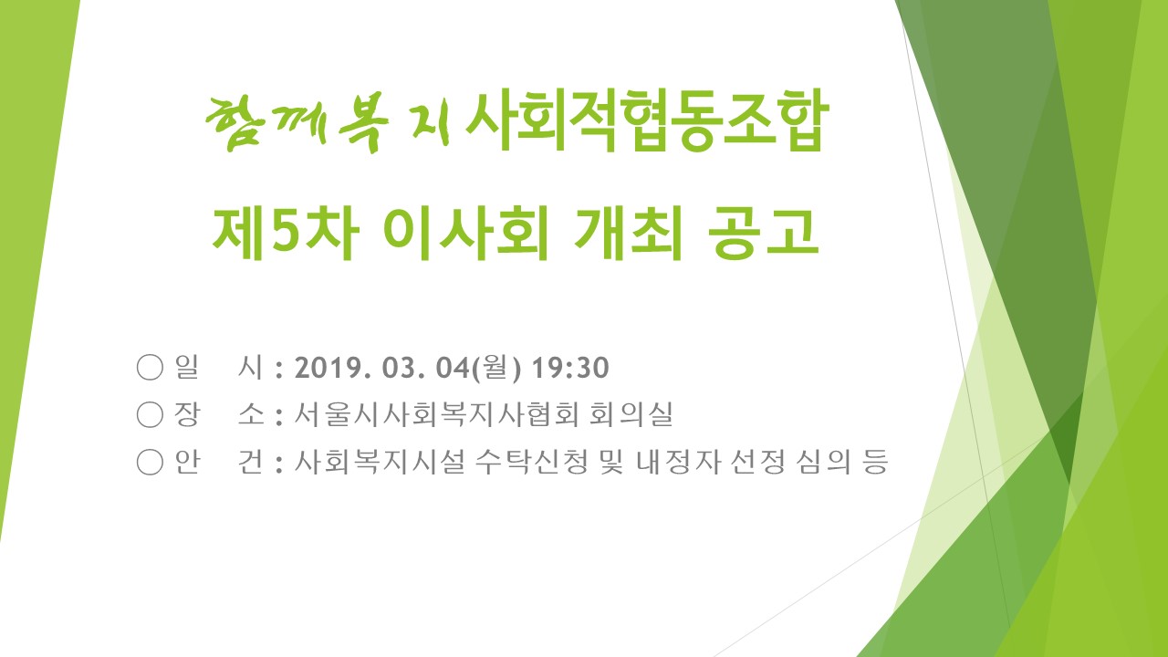 제5차 이사회 개최 공고 조합관리자 공지 0 271 2019.02.27 09:45 제 5차 이사회 개최 공고1. 일 시 : 2019. 03. 04(월) 19:302. 장 소 : 서울시사회복지사협회 회의실3. 안 건 : 사회복지시설 수탁신청 및 내정자 심의 등